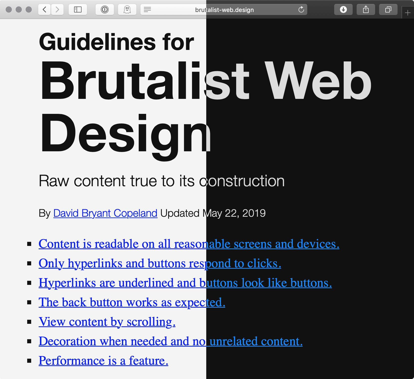 Brutalist Web Design Guidelines now support dark mode! If you are using a system that supports dark mode (e.g. MacOS) then the site will show you a different theme with less sun-blasting white background (see image below). I’m viewing this as an accessibility issue, so right in line with the ethos of Brutalist Web Design. Some users need a darker theme or want to have a less bright experience on their computer.